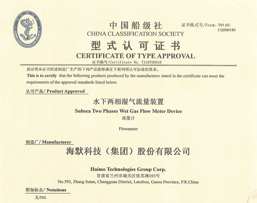 球盟会水下两相湿气流量装置获中国船级社(CCS)型式认证证书